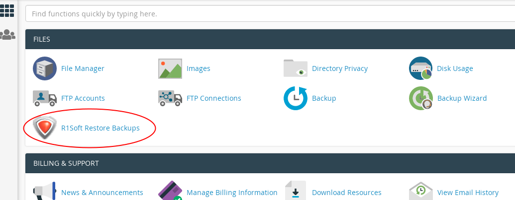 Step 1 - Under the Files section, click on the R1Soft Restore Backups icon.