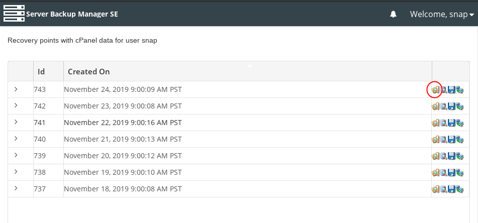 Step 2 - R1Soft will now open, dates and times of backups made will be listed under “Created On”. Click on the Folder icon next to the date you wish to restore.